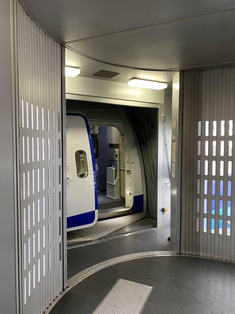 ボーディング・ブリッジをあるいて、飛行機に向かいます。見慣れたANAの青色が見えてきました。