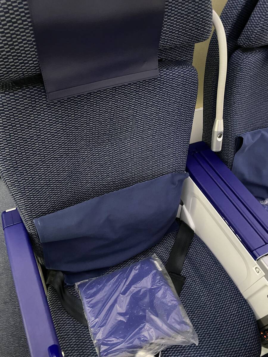 こちらが座席です。一見、エコノミークラスの座席と同じようですが、座席間隔が広かったり、肩のところに読書灯がついていたりという違いがあります。