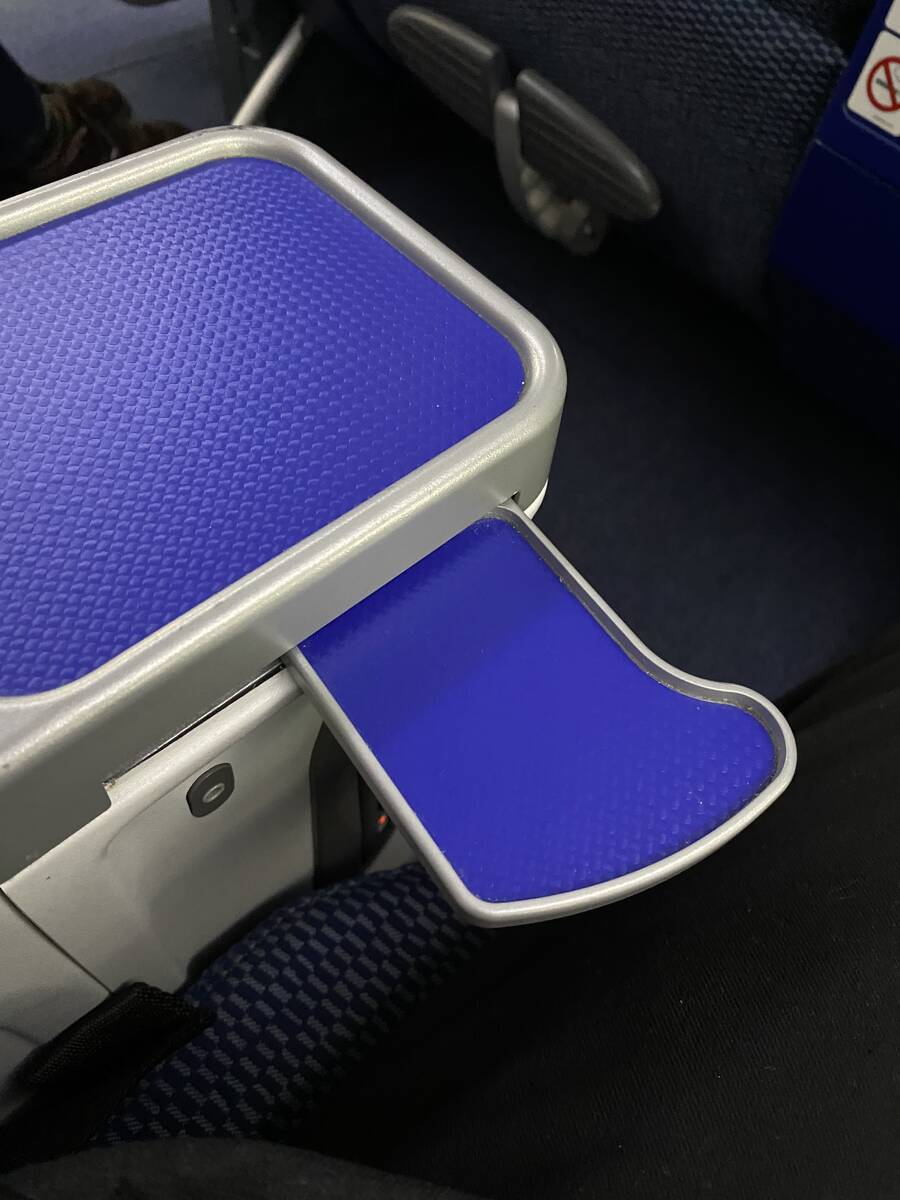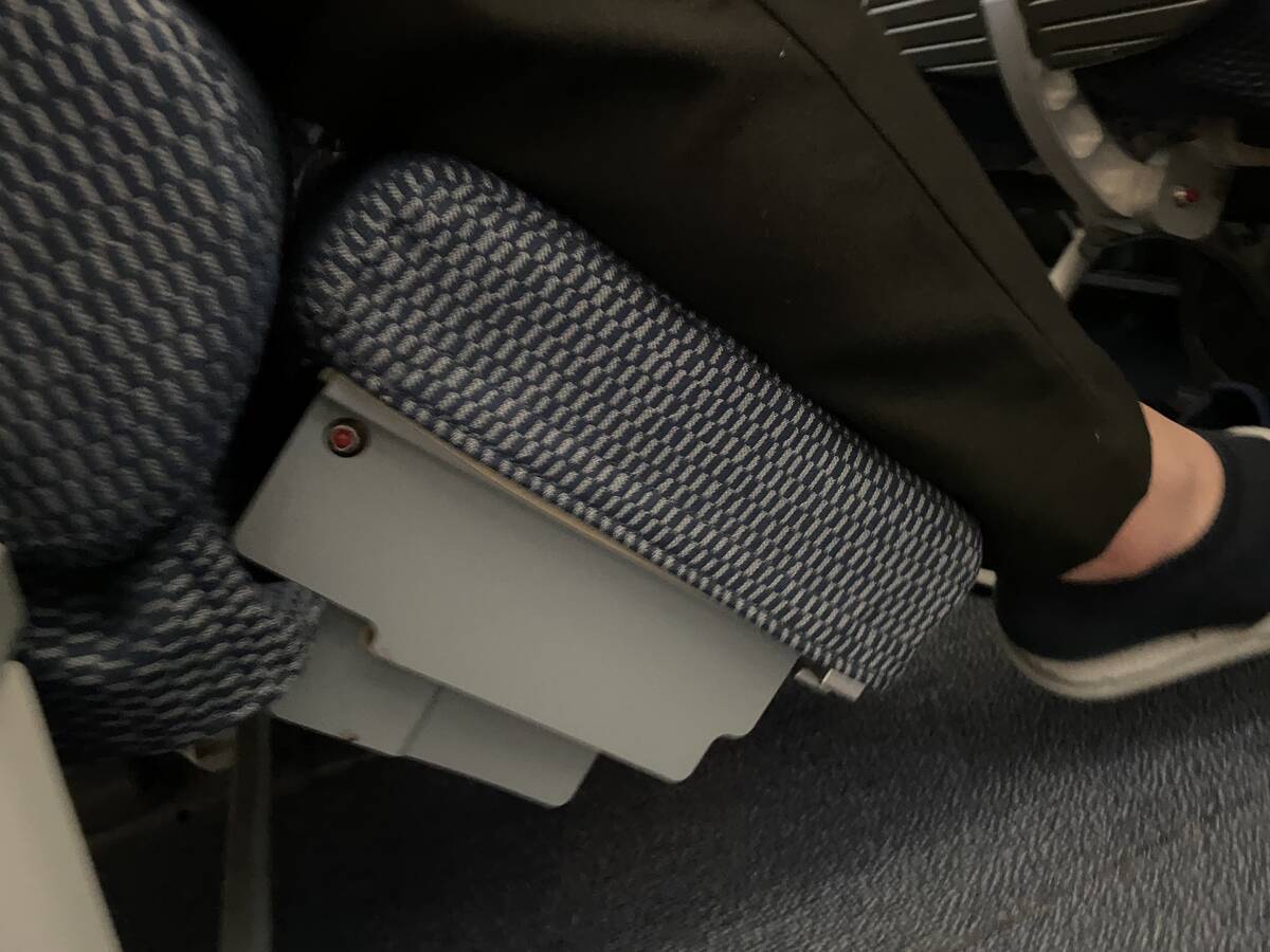 そしてエコノミークラスシートとの一番大きな違いは、こちらのレッグレストでしょう。斜め45度を少し超えるくらい?まではあげられるようです。水平にはなりませんが、これだけでも脚が大分楽ですね。