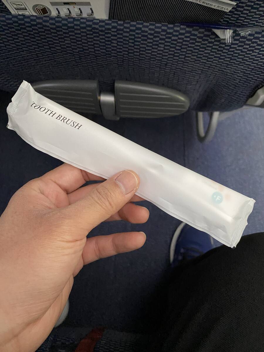 そして、プレミアムエコノミークラスではスリッパと歯ブラシがついています。こちらはエコノミークラスにはないサービスですね。エアラインによってはエコノミーでもスリッパや歯ブラシを提供していますが、ANAはプレミアムエコノミー以上で提供されるようです。