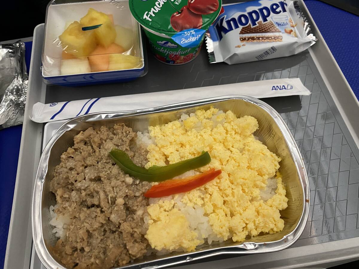 羽田への到着が近づいてきたということで、2回目の機内食です。そぼろとたまごの2色丼です。おいしい〜。